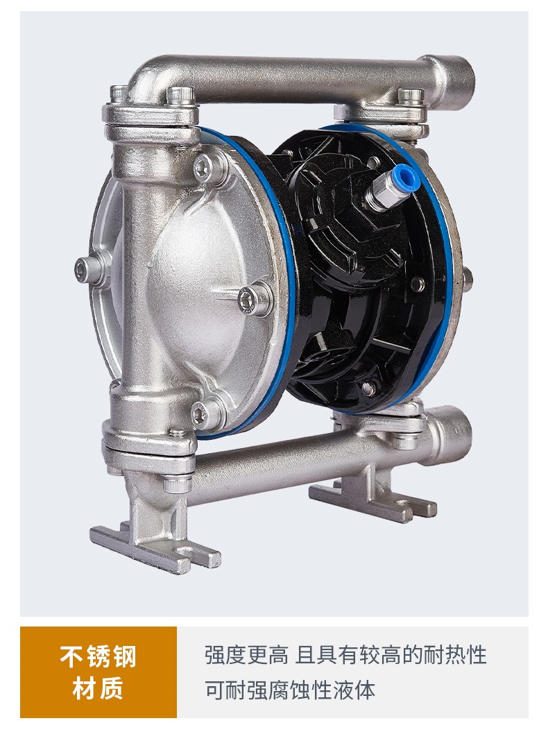 氣動(dòng)隔膜泵故障率高的配氣閥機(jī)構(gòu),改進(jìn)為先導(dǎo)式換氣機(jī)構(gòu)(內(nèi)置滑閥式氣閥),大大提高了產(chǎn)品的可靠性,真正的實(shí)現(xiàn)了永不死機(jī)。改型泵采用潔凈的壓縮空氣作為動(dòng)力源,既能抽送流動(dòng)的液體,又能輸送一些不易流動(dòng)的介質(zhì),集成了自吸泵、潛水泵、屏蔽泵、泥漿泵和雜質(zhì)泵等輸送機(jī)械的許多優(yōu)點(diǎn),對(duì)于各種腐蝕性液體,帶顆粒的液體,高粘度、易揮發(fā)、易燃、的液體,均能予以抽光吸盡。是使用廣泛的特種泵。該泵無(wú)旋轉(zhuǎn)部件,沒(méi)有軸封,隔膜將抽送的介質(zhì)與泵的運(yùn)動(dòng)部件、工作介質(zhì)完全隔開(kāi),所輸送的介質(zhì)不會(huì)向外泄露,是一種常見(jiàn)的無(wú)泄漏泵。